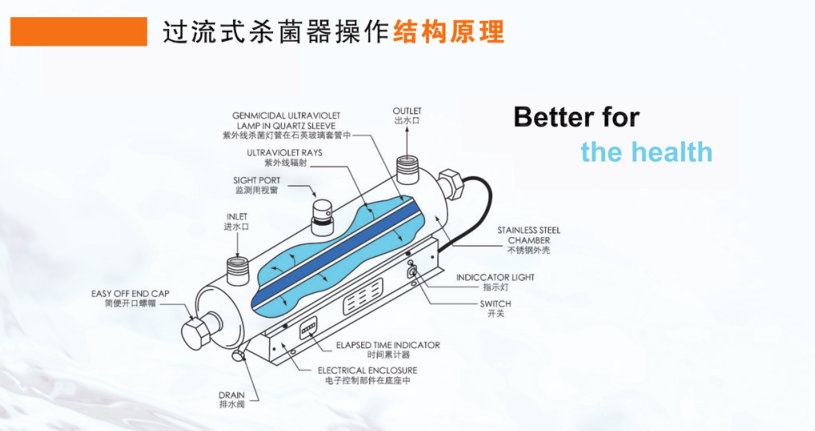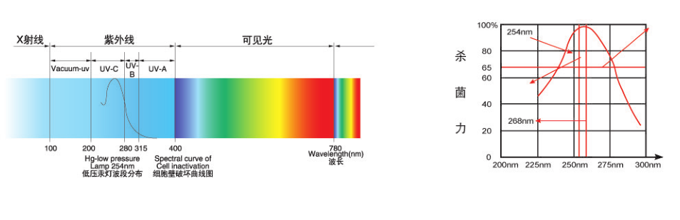 紫外線是介于可視光線和X射線之間的電磁波頻譜。200nm至400nm的紫外光譜有很強的殺菌效力, 其峰值在265nm。 在這個波長范圍內(nèi)的紫外線主要是通過刺穿細胞膜,破壞細胞內(nèi)脫氧核糖核酸和破壞細胞內(nèi)的其它分子,使微生物不能再復制和繁殖,而最終達到消毒作用。 紫外線殺菌器實物拍攝依照波長范圍,可將紫外線分為4個波段: